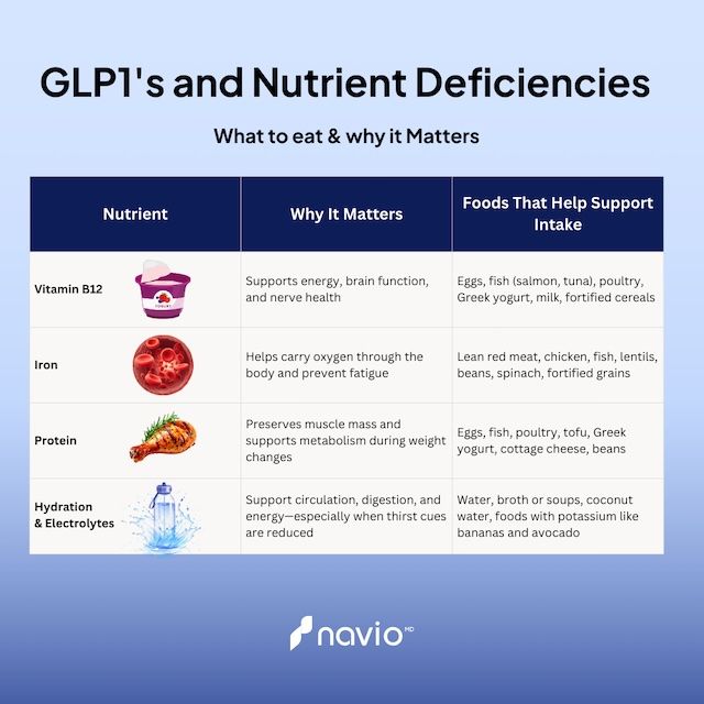 Not everyone taking GLP-1 will develop nutrient deficiencies. However, some nutrients tend to deserve closer attention when appetite is reduced. When intake of these nutrients drops too low, people may notice fatigue, weakness, lightheadedness, or reduced stamina.